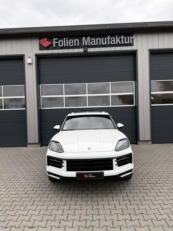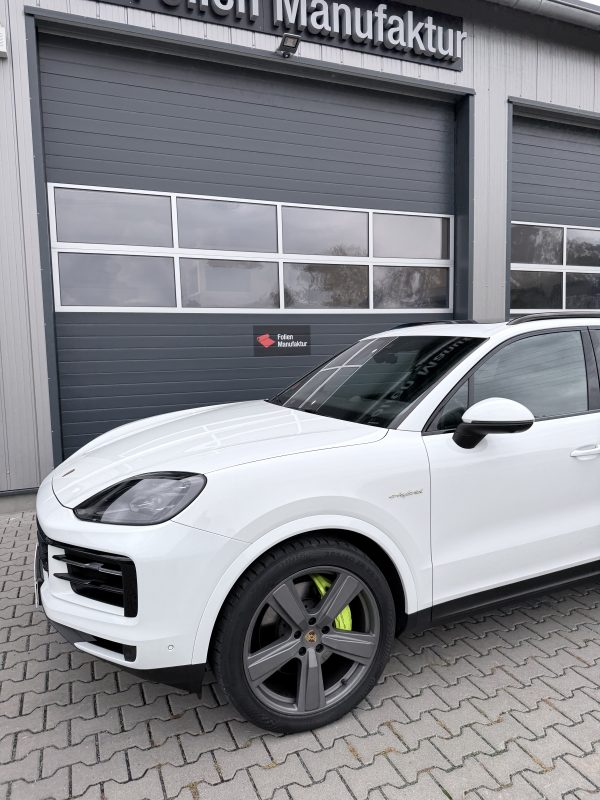 Dieser elegante Cayenne durfte von uns ein Frontpaket aus hochwertiger Lackschutzfolie (PPF) erhalten. Damit sind die meistbeanspruchten Bereiche wie Frontstoßstange, Haube, Kotflügel und Spiegel optimal vor Steinschlägen, Kratzern und Witterungseinflüssen geschützt – unsichtbar, aber effektiv.