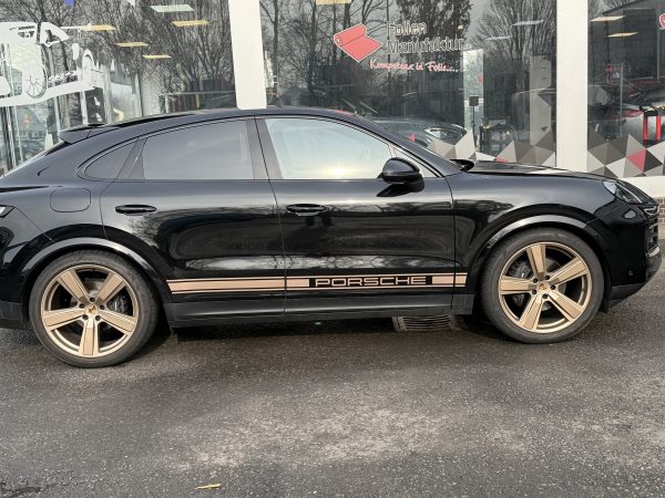 Dieser Porsche Cayenne erhielt eine hochwertige Lackschutzfolie (PPF), um den Originallack im Alltag zuverlässig zu schützen. Die goldenen Felgen und der goldene Seitenstreifen setzen dabei einen markanten, edlen Kontrast zur Fahrzeuglinie. Ziel war ein unaufdringlich perfektes Finish, das Schutz und Design harmonisch verbindet.