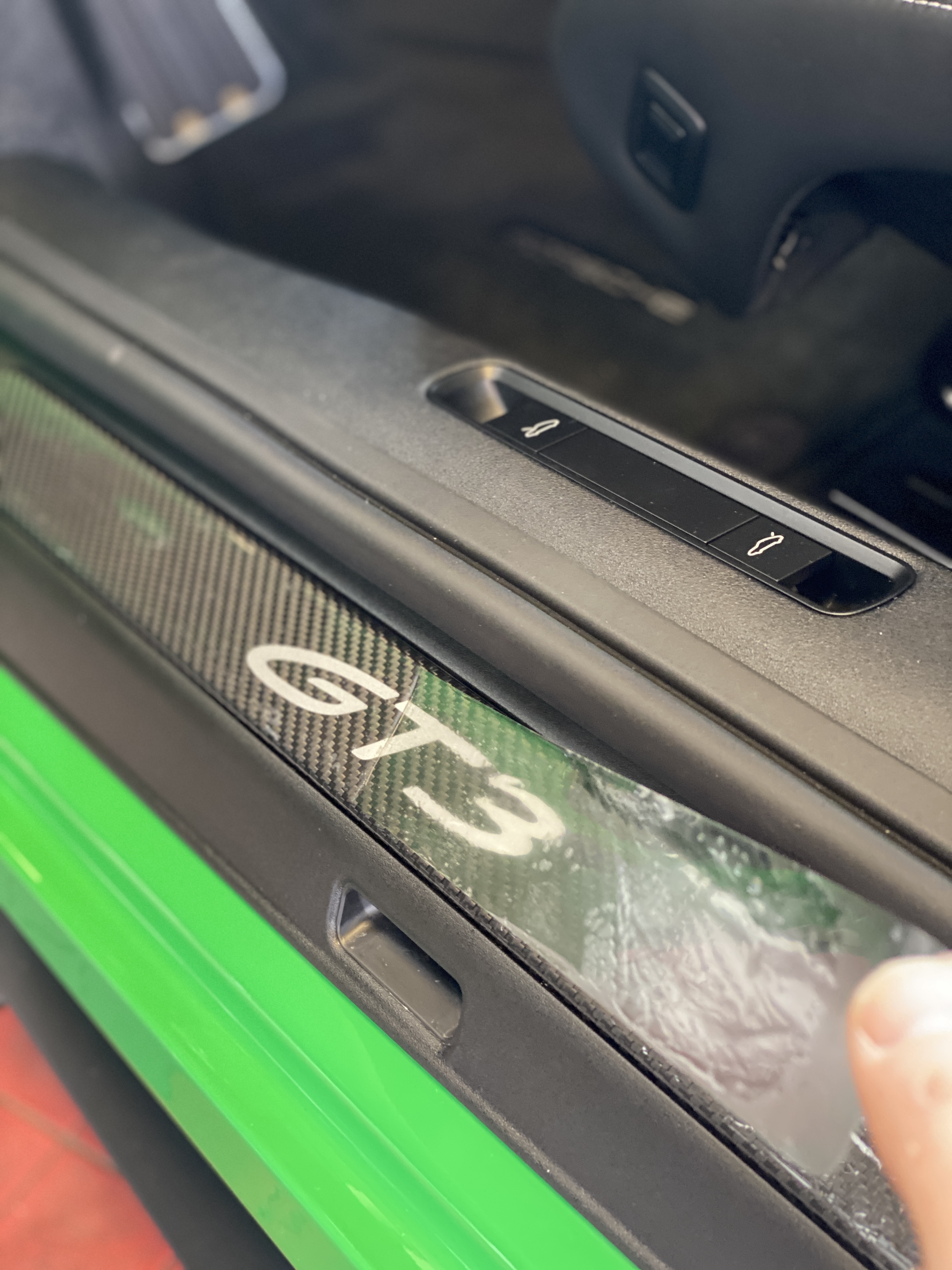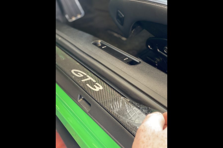 Vor der Verarbeitung der Lackschutzfolie wurde der Lack gründlich vorbereitet, um eine saubere, gleichmäßige Haftung zu gewährleisten. Anschließend erfolgte die Applikation der PPF in Glanz mit passgenauem Zuschnitt und sauberer Kantenführung, damit die Folie optisch dezent bleibt und sich harmonisch in die Karosserieform einfügt. Besonderes Augenmerk lag auf den exponierten Bereichen, die bei einem GT3 typischerweise stark beansprucht werden.