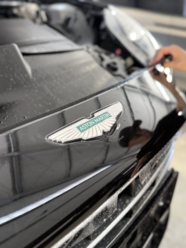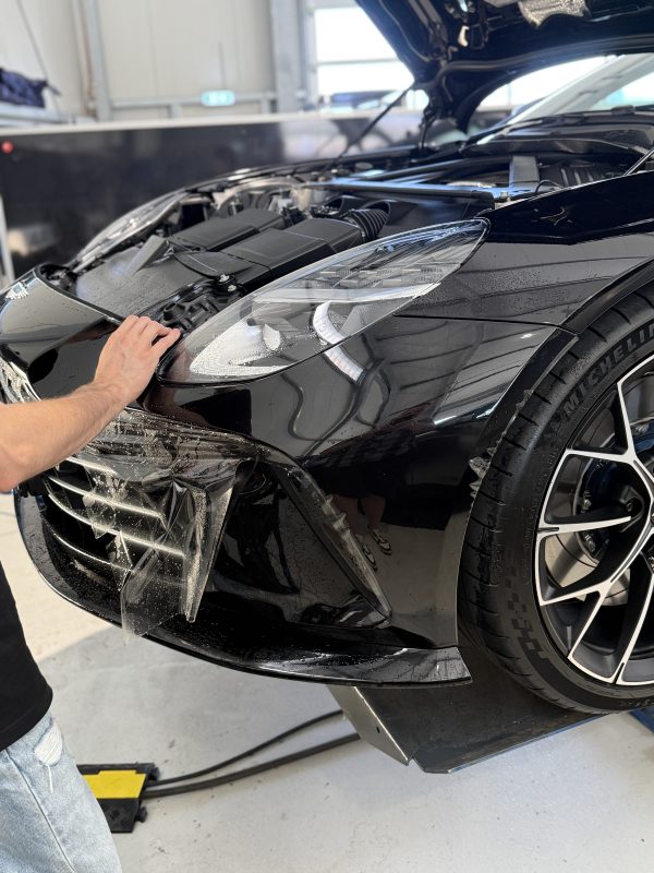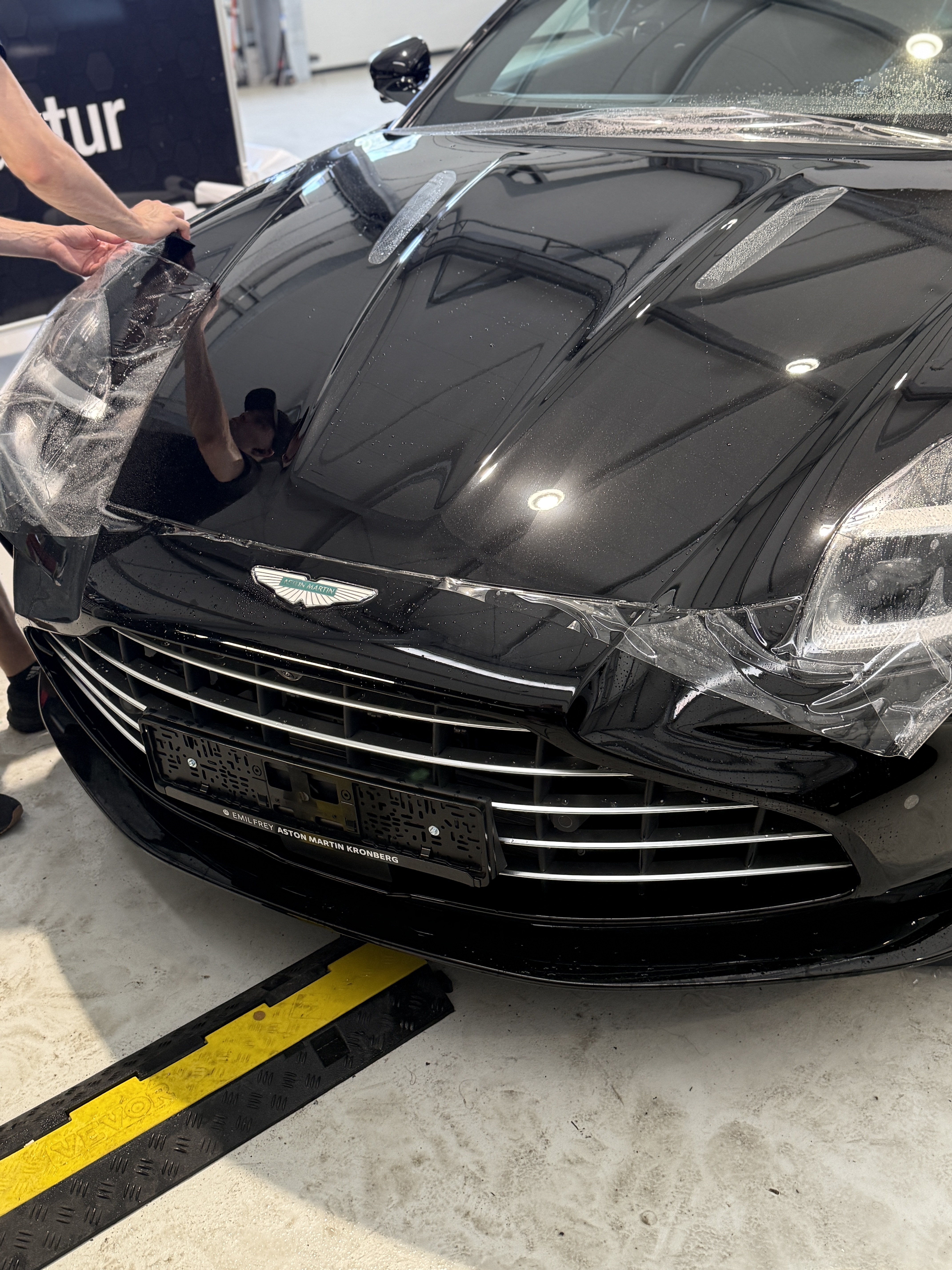 Die Oberflächen wurden sorgfältig gereinigt und vorbereitet, damit die Lackschutzfolie optimal haftet und sich spannungsfrei an Konturen und Kanten anlegt. Anschließend erfolgte die präzise Applikation der PPF auf den relevanten Karosseriebereichen, mit besonderem Augenmerk auf saubere Übergänge. Das glanz Finish sorgt dafür, dass Reflexionen und Farbtiefe des Aston Martin DB12 sichtbar unverändert bleiben.