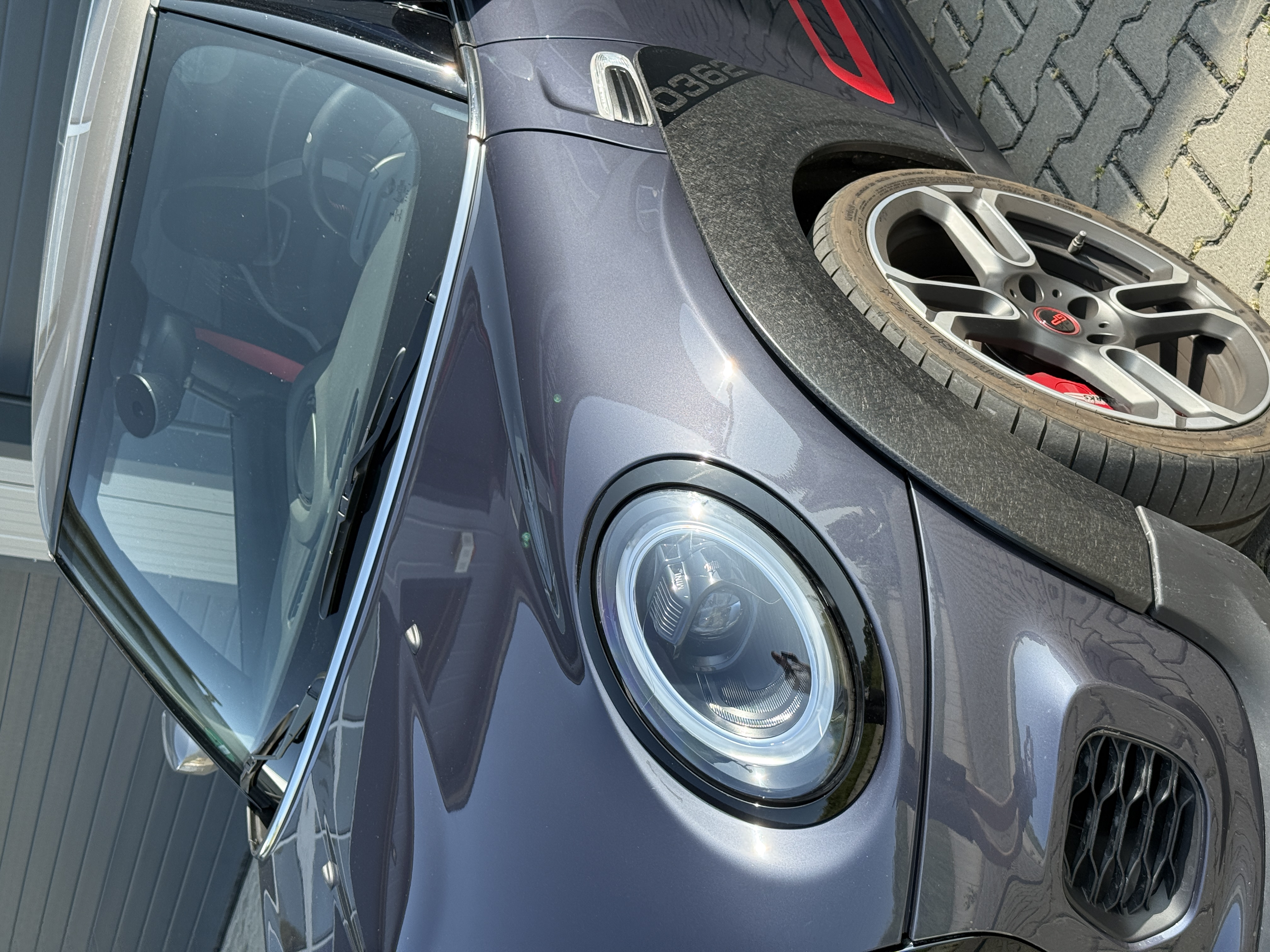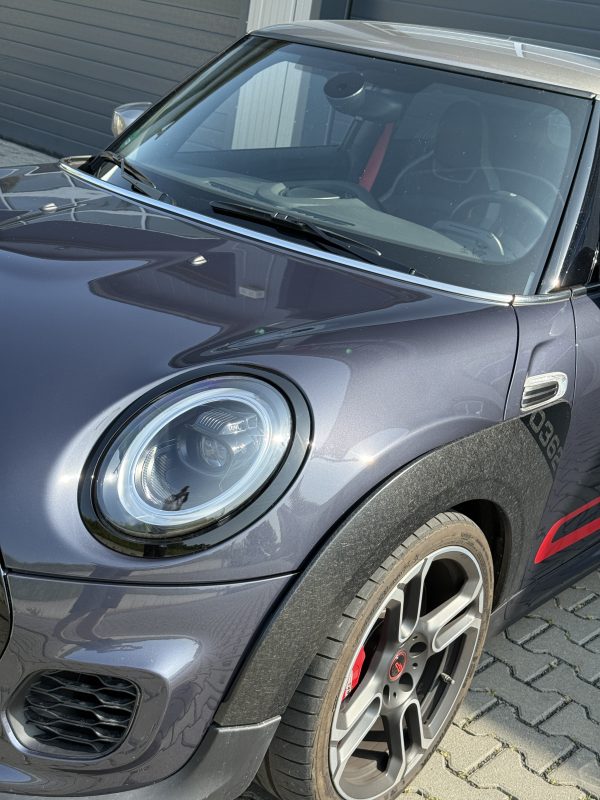 Die Fahrzeugoberflächen wurden gründlich gereinigt, dekontaminiert und für eine optimale Haftung der PPF vorbereitet. Anschließend erfolgte die passgenaue Applikation der Lackschutzfolie in Glanz, mit besonderem Augenmerk auf Kanten, Sicken und stark beanspruchte Bereiche. Durch saubere Übergänge und präzise Anpassung bleibt die originale Linienführung des Mini John Cooper Works GP vollständig erhalten.