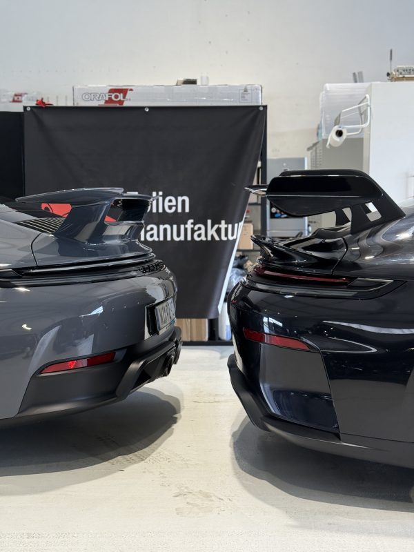 Für den Porsche wurde eine hochwertige Lackschutzfolie (PPF) appliziert, abgestimmt auf die Konturen und Bauteile des Aero Kits. Anspruchsvolle Bereiche wie Stoßfänger, Schweller und Anbauteile wurden passgenau verarbeitet, damit Kanten sauber sitzen und die Folie optisch nahezu unsichtbar bleibt. Die Verlegung erfolgte mit Fokus auf gleichmäßige Ausrichtung, saubere Abschlüsse und eine harmonische Integration in das Gesamtbild.