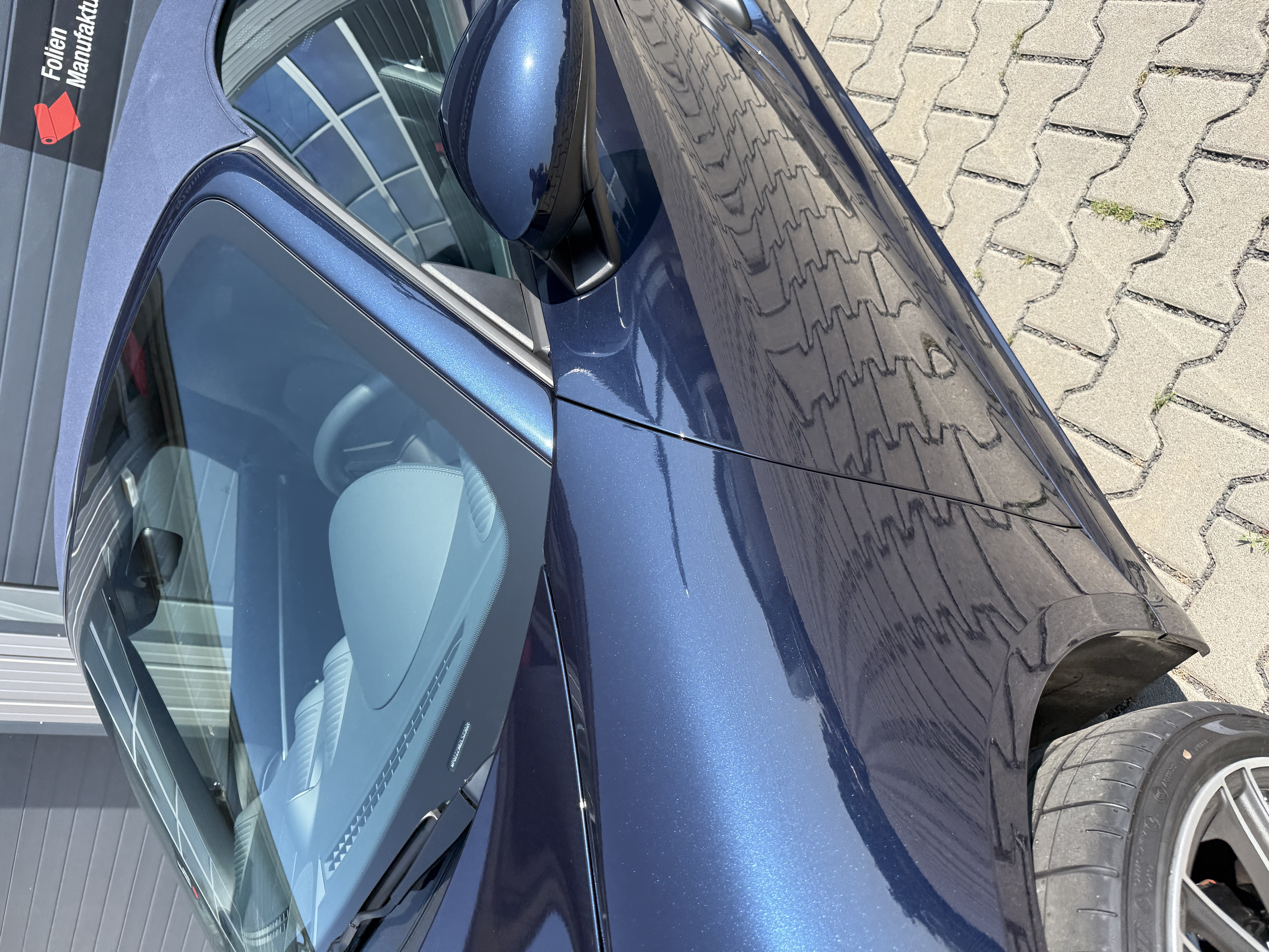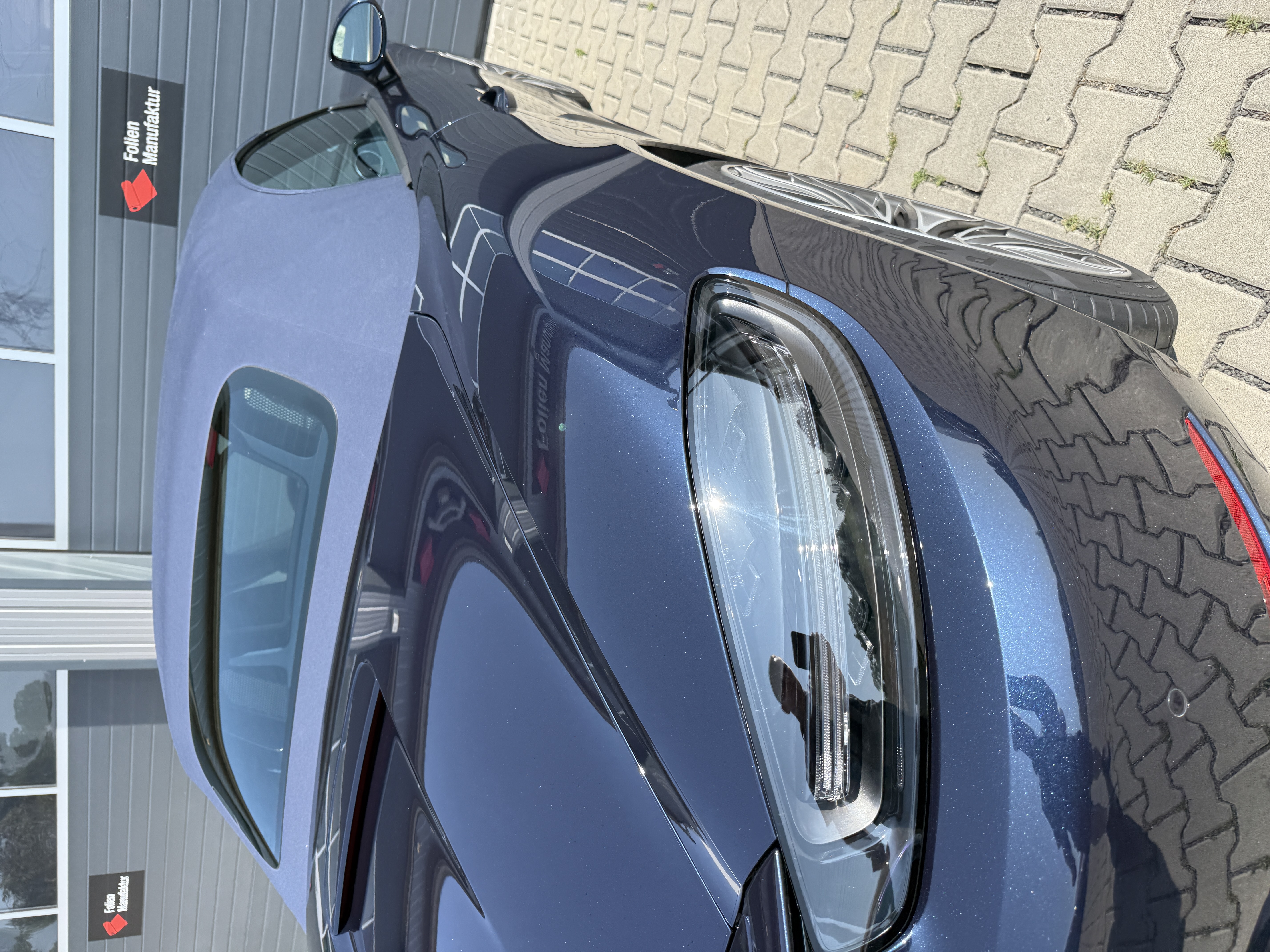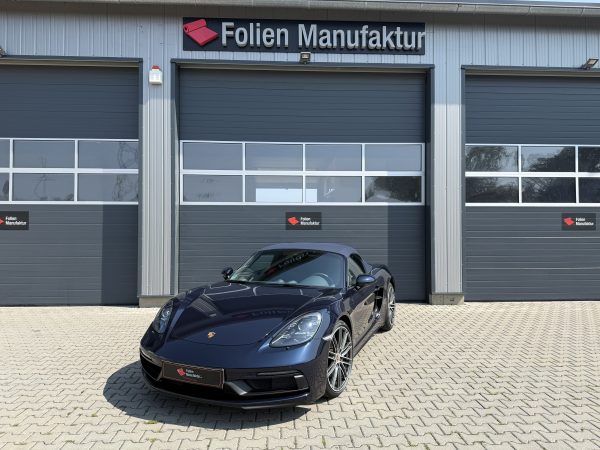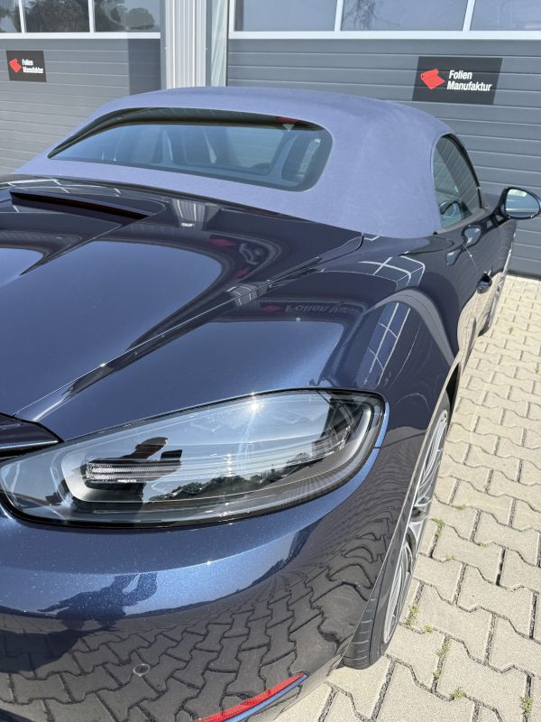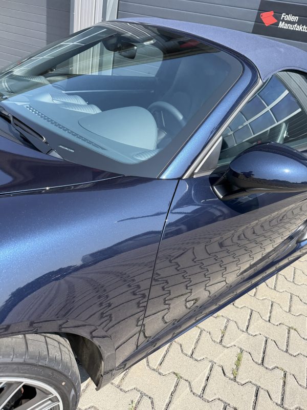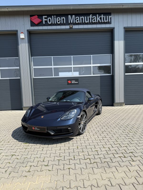 Der Porsche Boxster GTS präsentiert sich weiterhin im originalen Look, nun jedoch mit einem zusätzlichen Schutzschild für den Lack. Die Folienkanten sind sauber integriert, die Oberfläche wirkt homogen und hochwertig. So bleibt der Charakter des Fahrzeugs erhalten, während die empfindlichen Bereiche zuverlässig abgesichert sind.