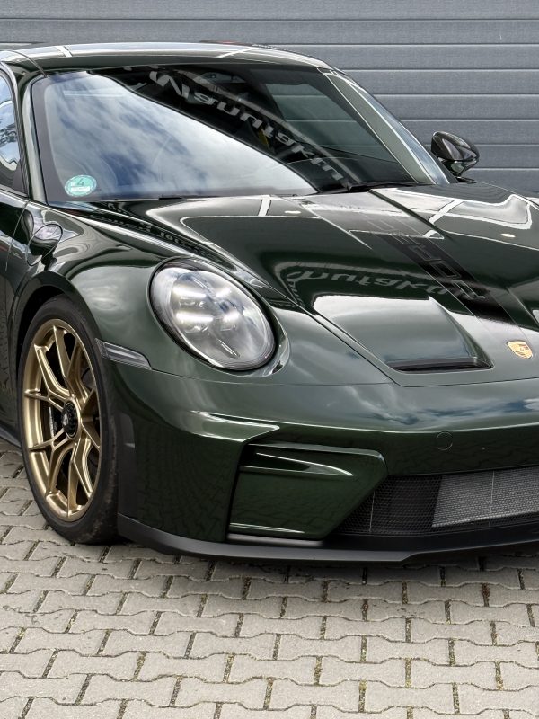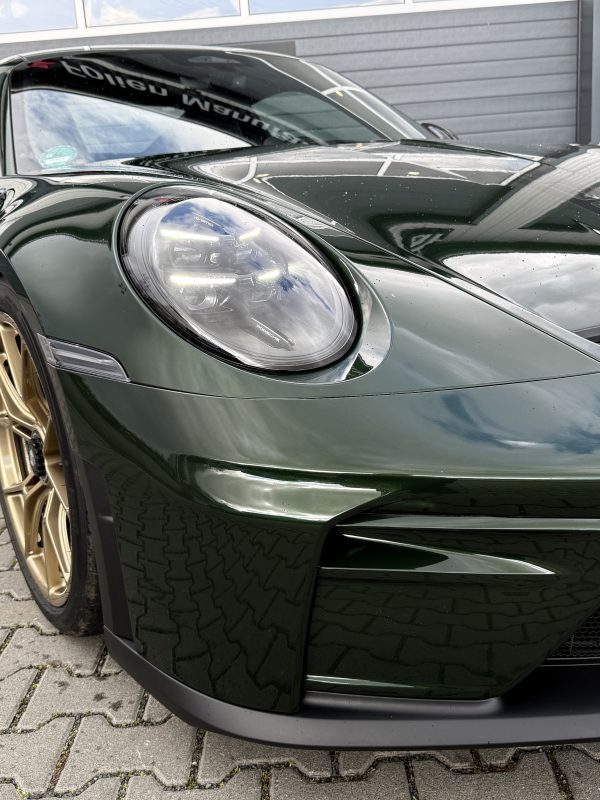 Das Resultat ist ein Porsche GT3 Touring mit sichtbar gesteigerter Lackruhe und deutlich mehr Alltagstauglichkeit, ohne die authentische Touring-Ästhetik zu verändern. Oak Green Metallic wirkt satter und klarer, Reflexionen bleiben präzise, und die goldenen Felgen setzen weiterhin den edlen Kontrastpunkt. Ein Finish, das Performance und Premium-Detailqualität auf den Punkt bringt – geschützt, hochwertig und kompromisslos original.