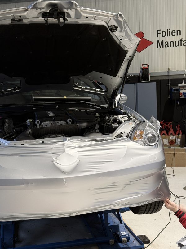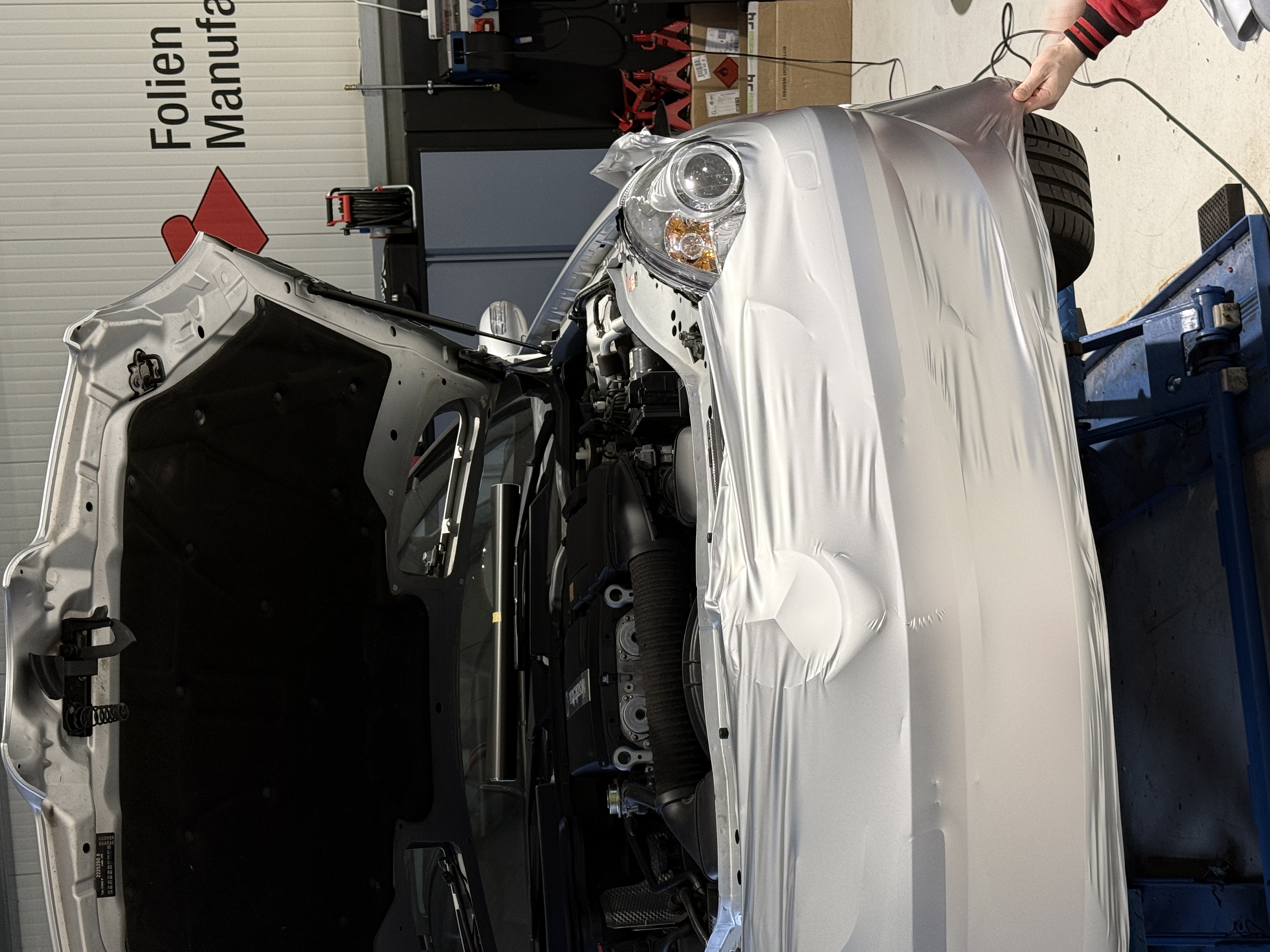 Vor der Vollfolierung wurde der Lack gründlich gereinigt und entfettet, um eine optimale Haftung und ein sauberes Finish sicherzustellen. Anschließend erfolgte die präzise Applikation der Oracal Folie in Seidenglanz Silber Matt, inklusive sauberer Kantenführung und passgenauer Anpassung an Konturen und Sicken. Übergänge, Kanten und stark geformte Bereiche wurden mit besonderer Sorgfalt verarbeitet, damit das Gesamtbild aus jeder Perspektive stimmig wirkt.
