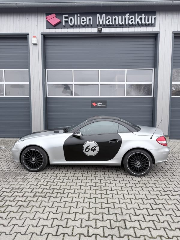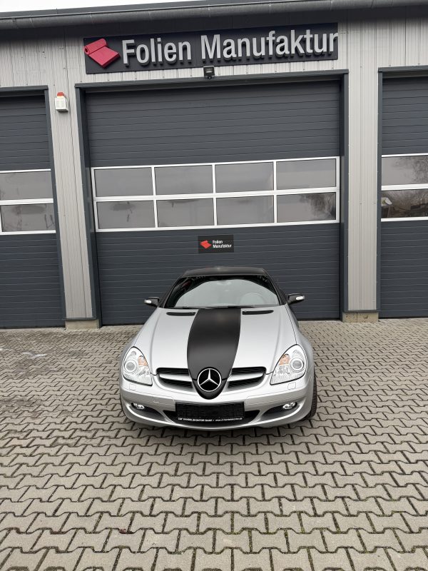 Für diesen Mercedes-Benz SLK wurde eine Vollfolierung in einem modernen Seidenglanz-Finish umgesetzt. Die Farbe Silber Matt von Oracal verleiht dem Roadster eine klarere Linienführung und eine zeitgemäße, reduzierte Anmutung. Durch die Folierung bleibt der Originallack unangetastet und das Fahrzeug erhält eine homogene, hochwertige Oberfläche.