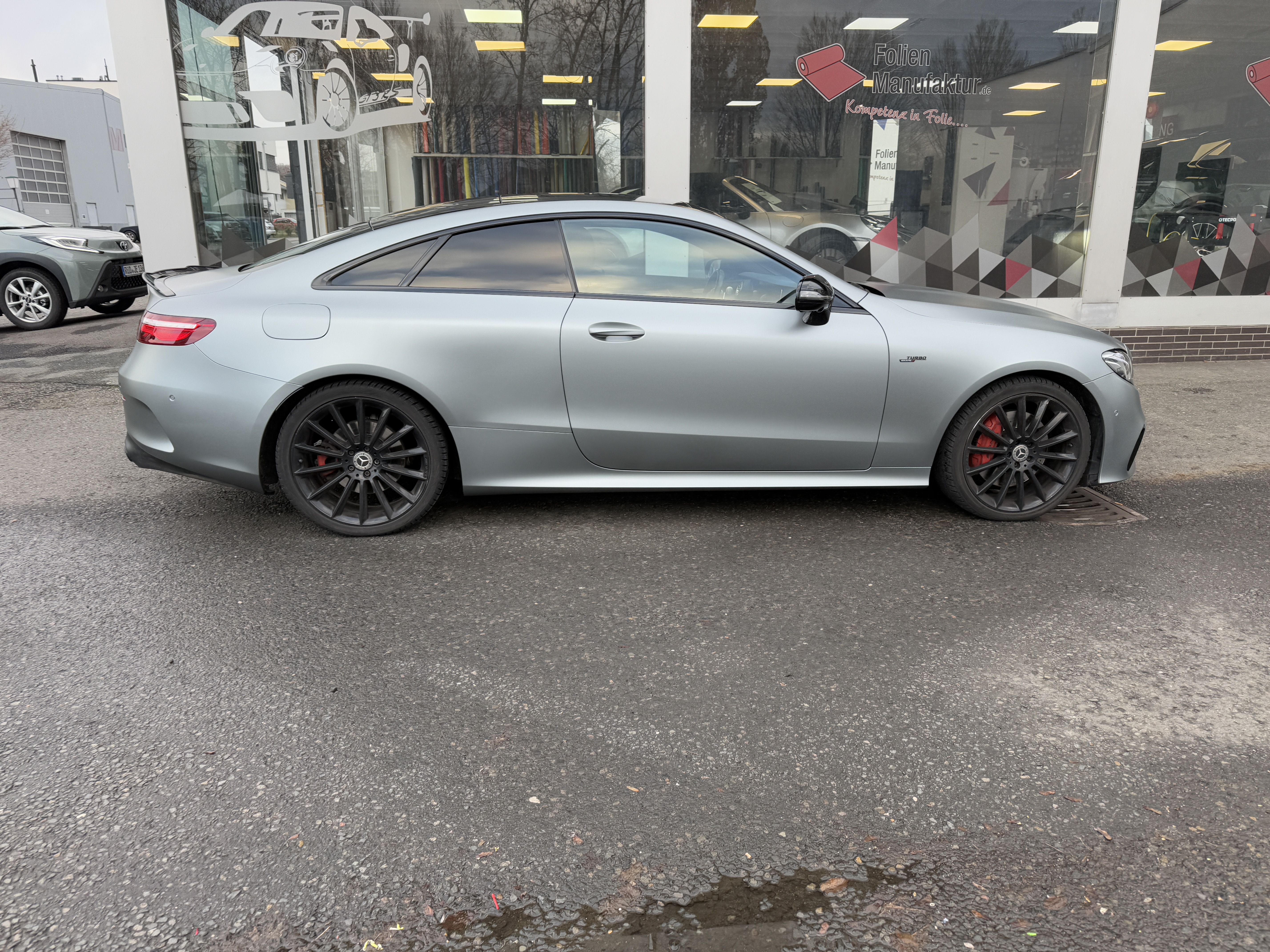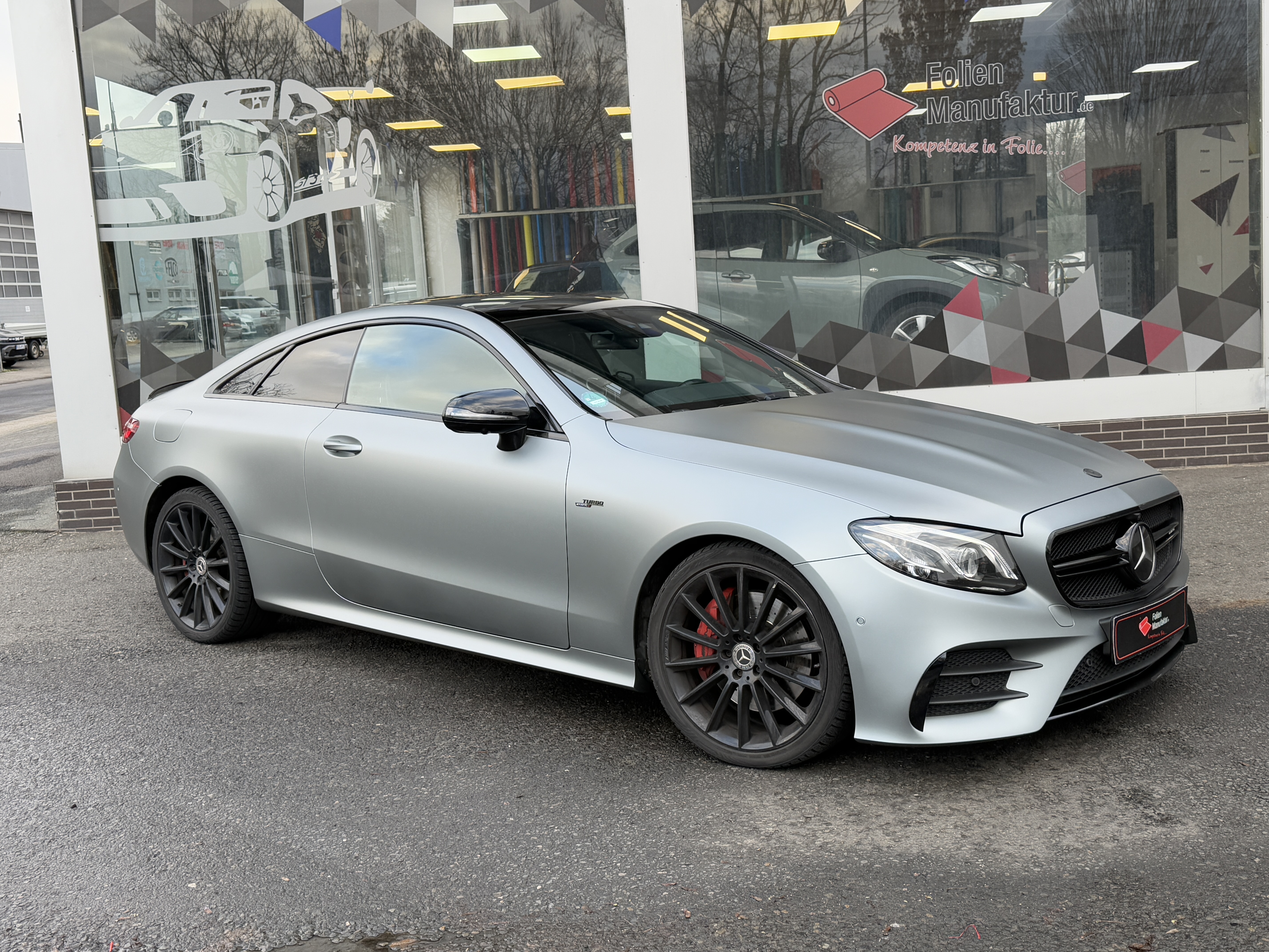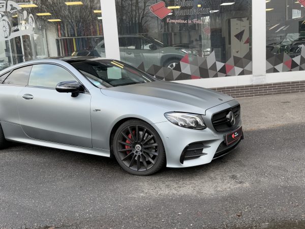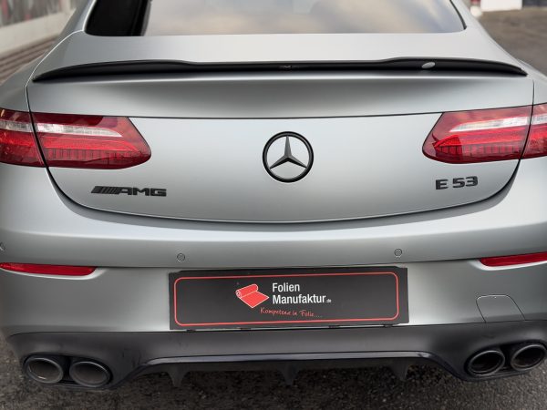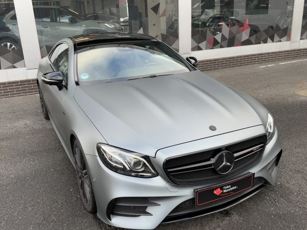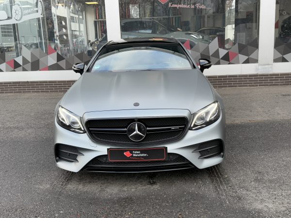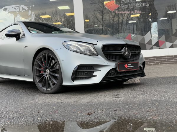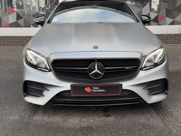 Für diese Mercedes E-Klasse wurde eine hochwertige Vollfolierung in matter Optik umgesetzt. Ziel war ein moderner, reduzierter Look mit klarer Linienführung, der die Eleganz des Fahrzeugs unterstreicht. Die matte Oberfläche sorgt für eine edle Anmutung und eine gleichmäßige Wirkung über alle Karosserieteile hinweg.
