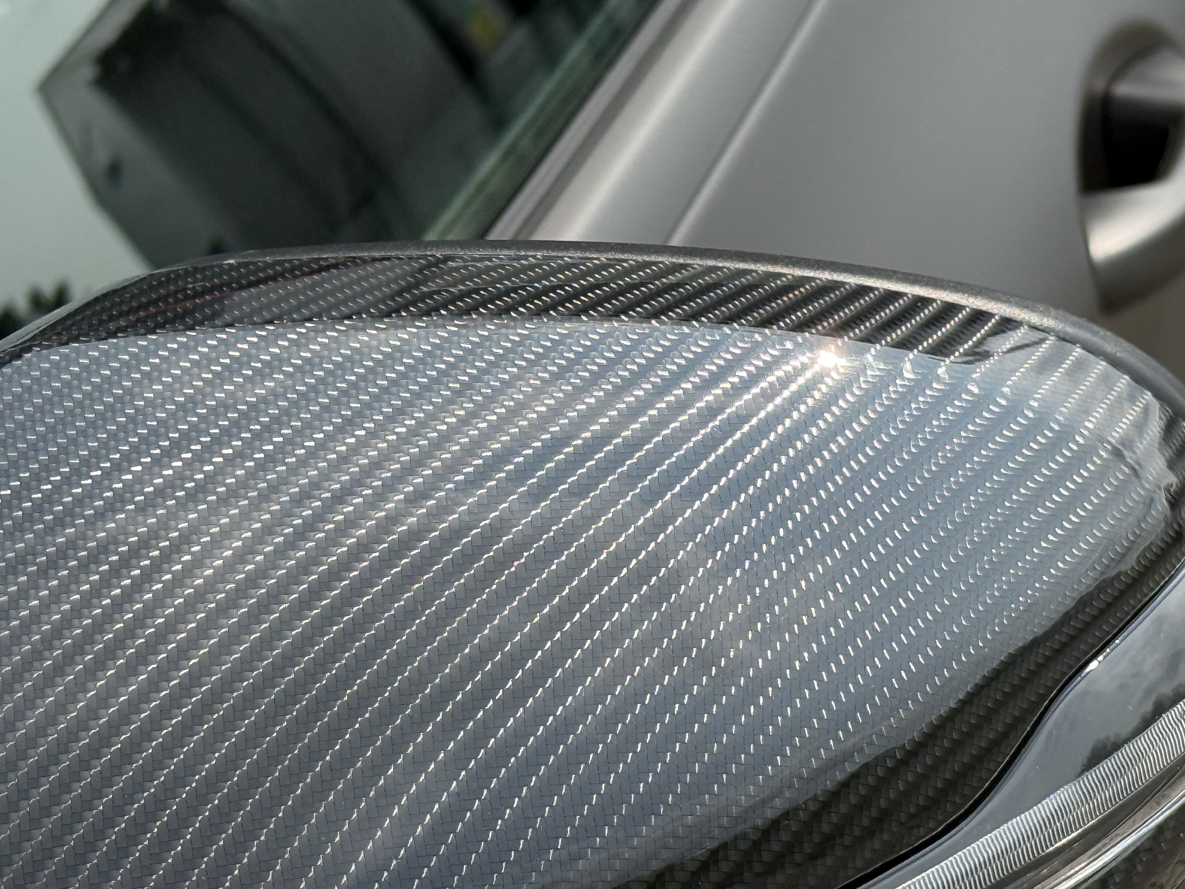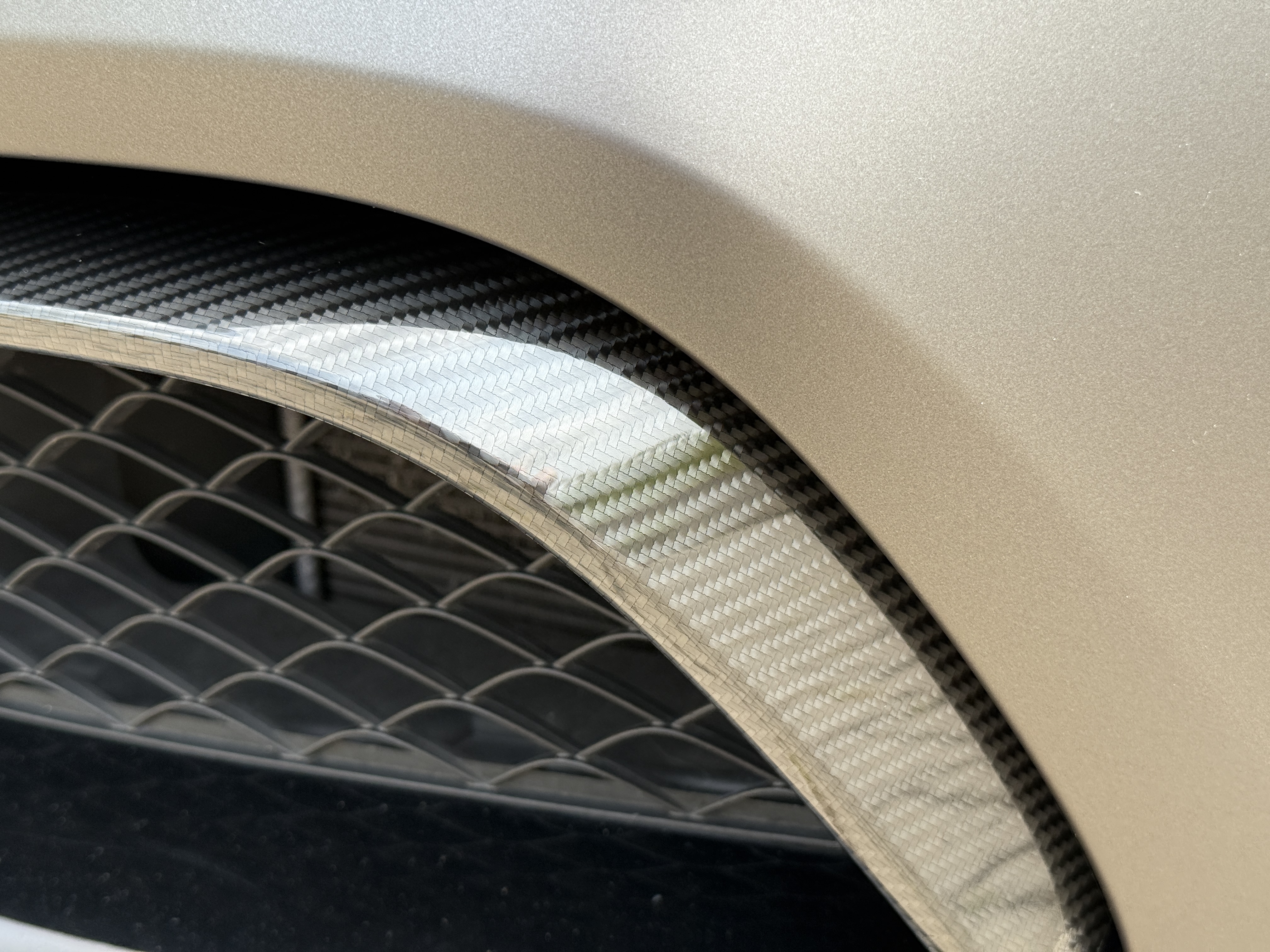 Für die Lackschutzfolie wurden die relevanten Fahrzeugflächen präzise vorbereitet, gereinigt und entfettet, um eine optimale Haftung und ein gleichmäßiges Finish zu gewährleisten. Anschließend erfolgte die Applikation der farbigen PPF in Cys mit sauberer Kantenführung und passgenauem Zuschnitt. Die Carbon PPF hochglänzend wurde als Akzentfolie eingesetzt, um Kontraste zu setzen und ausgewählte Bereiche optisch zu betonen. Durch sorgfältiges Ausarbeiten von Konturen und Übergängen entsteht eine stimmige, werksnahe Anmutung.