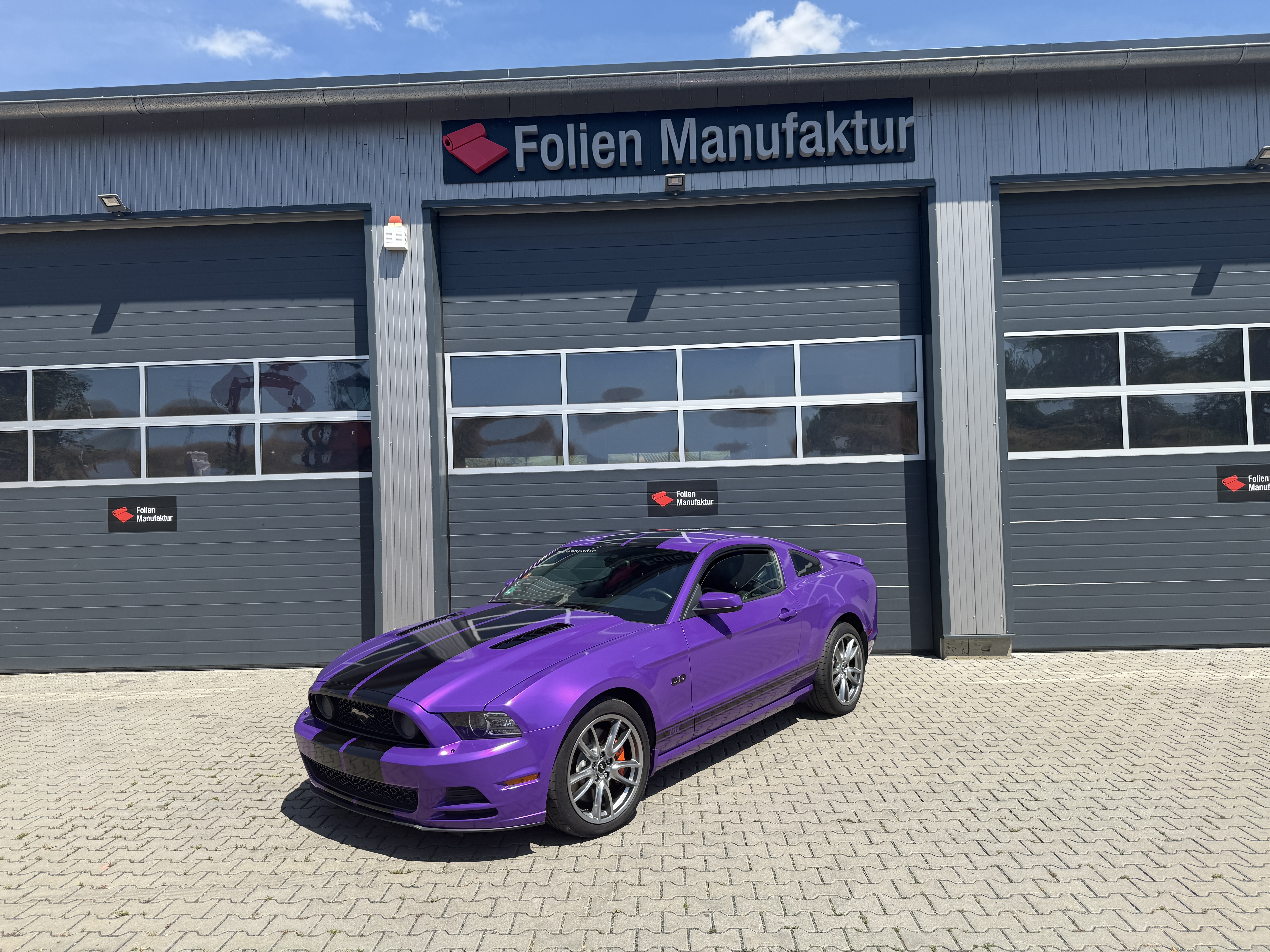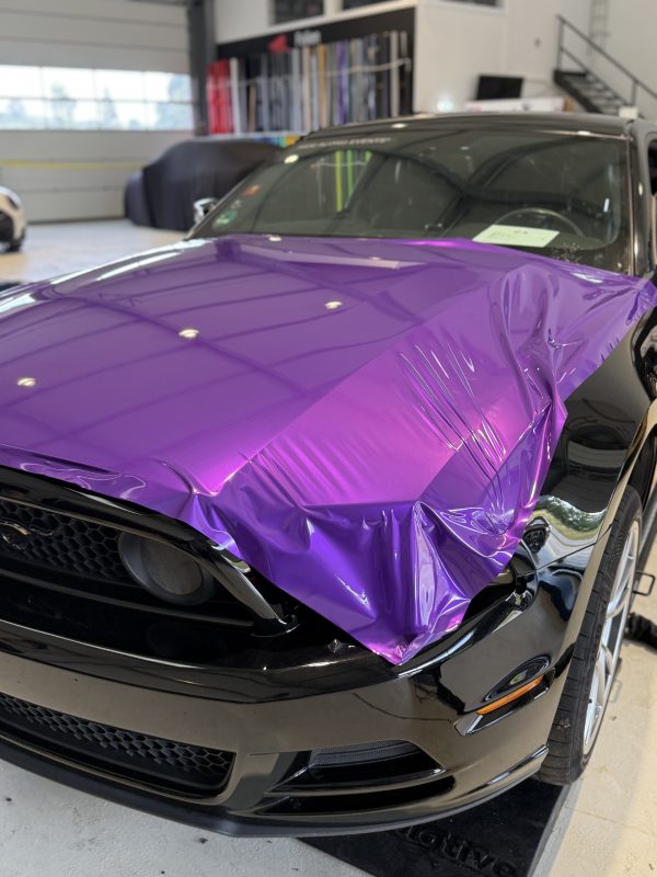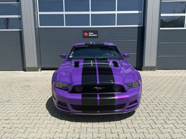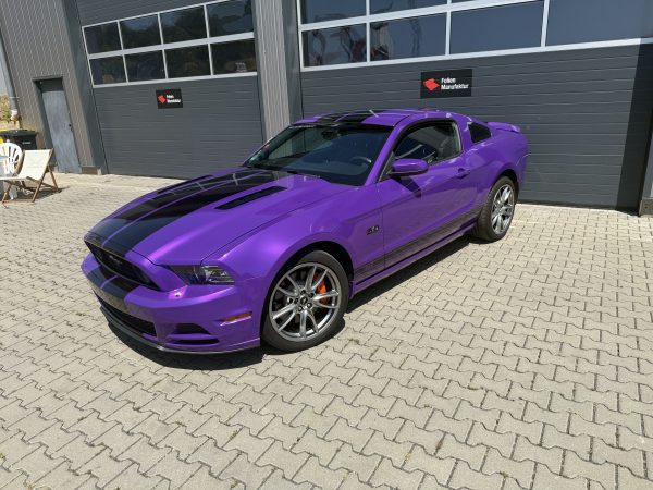 Für diesen Ford Mustang wurde eine hochwertige Vollfolierung im glanz Finish umgesetzt. Die Wahl fiel auf HX 20 Godess Purple Gloss, um die markante Linienführung des Fahrzeugs besonders klar zu betonen. Ergänzt wurde das Farbkonzept durch schwarz glänzende Streifen, die den Auftritt sportlich und präzise abrunden.