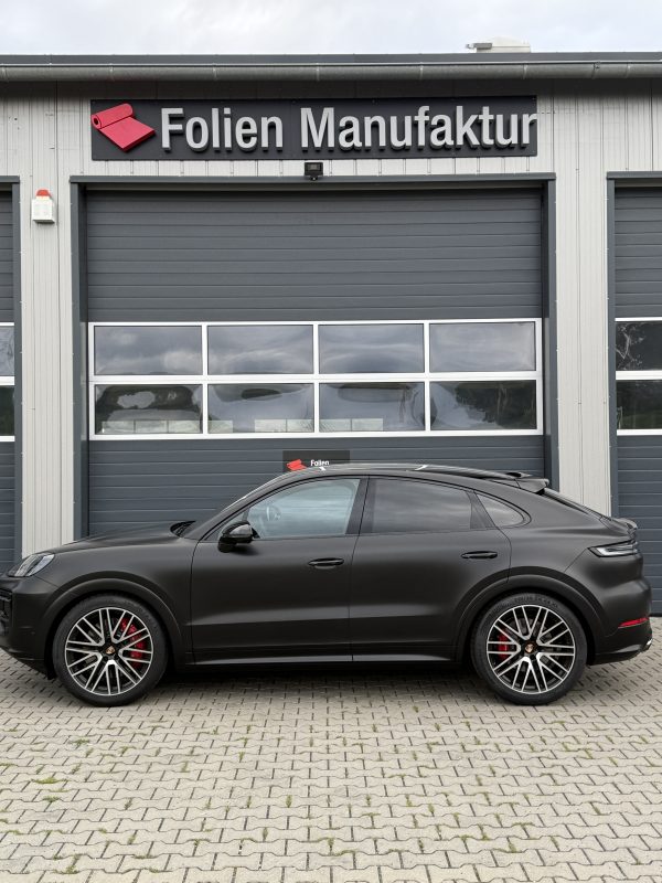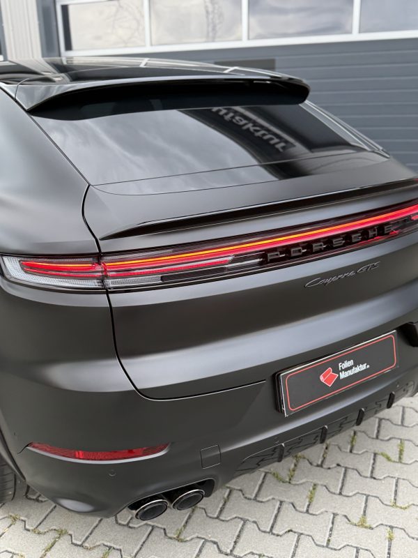 Das Resultat ist ein Porsche Cayenne GTS mit klarer, moderner Anmutung und einer seidig-eleganten Oberfläche, die je nach Lichteinfall subtil variiert. Die Vollfolierung sorgt für ein einheitliches Gesamtbild und erhält gleichzeitig den Originallack unter der Folie. Insgesamt wirkt das Fahrzeug präziser, sportlicher und dauerhaft wertig.