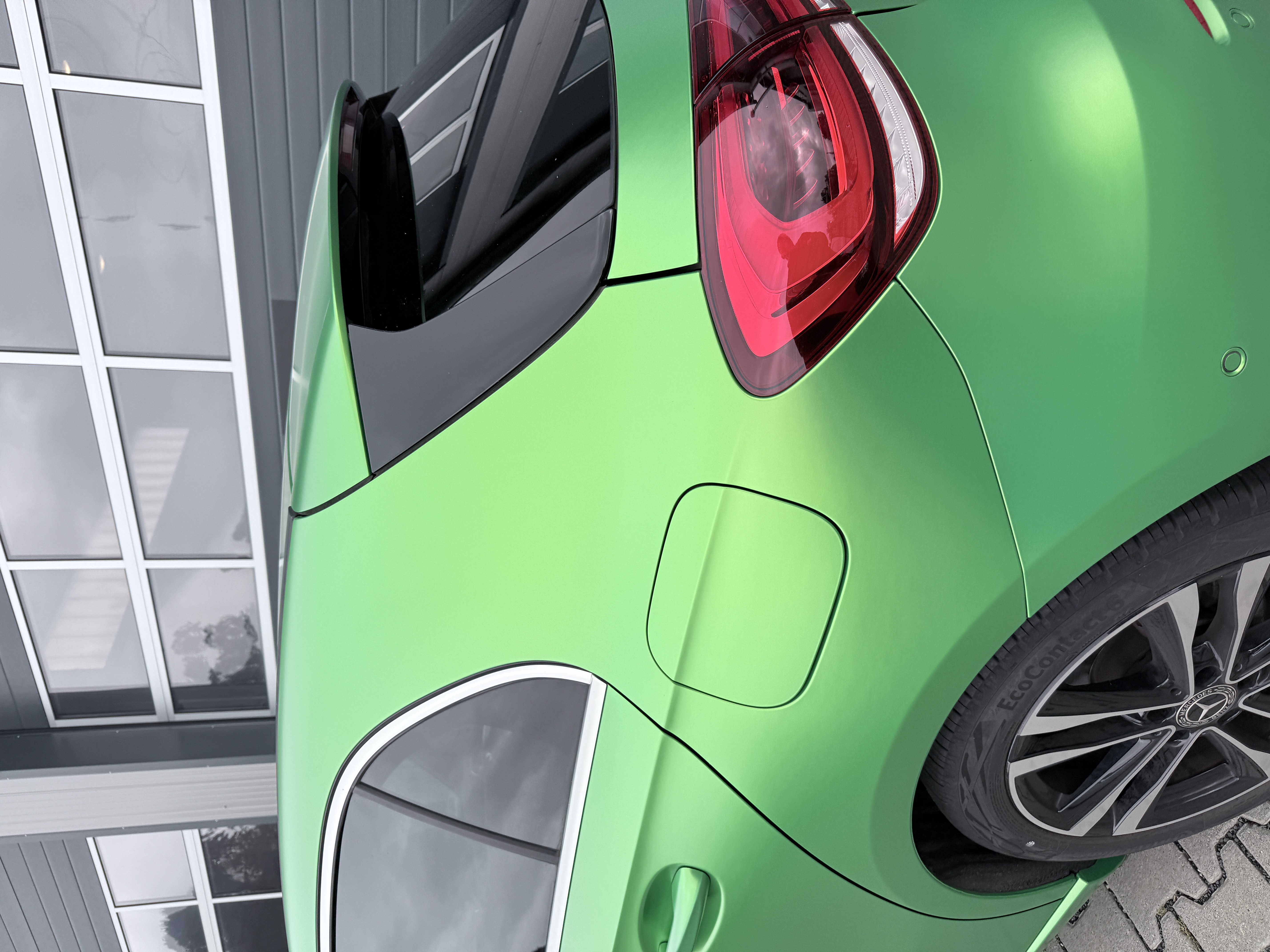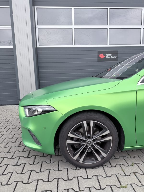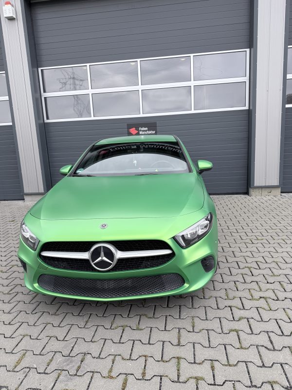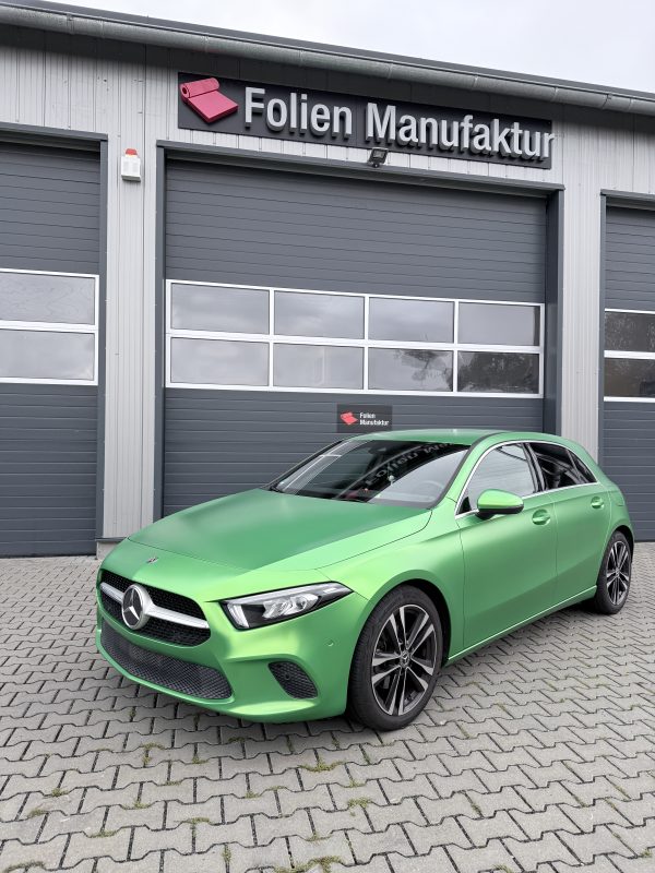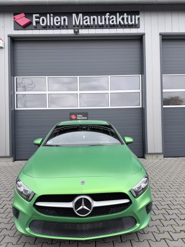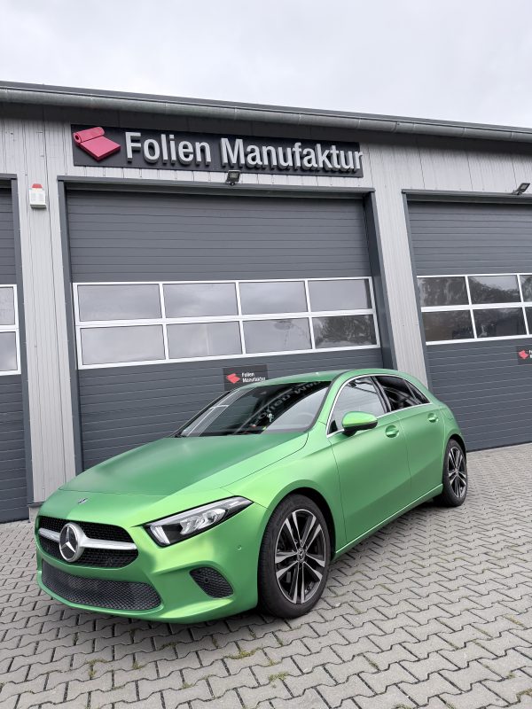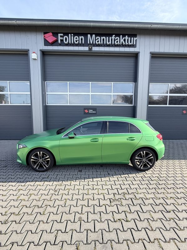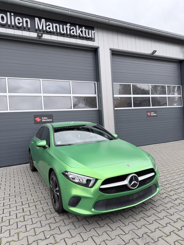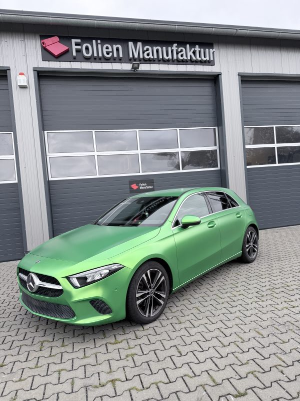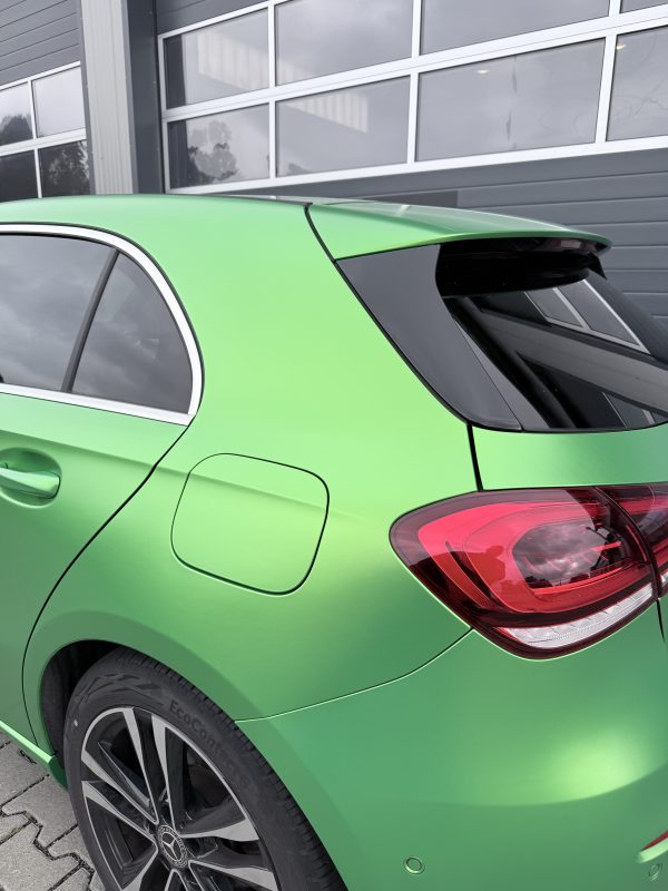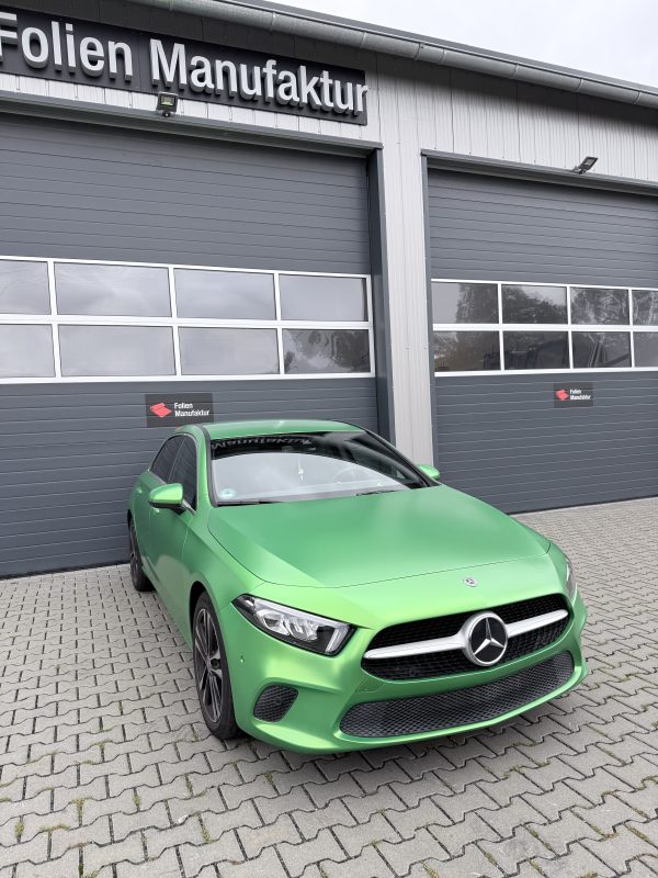 Für diese Mercedes-Benz A-Klasse stand eine hochwertige Vollfolierung im Fokus, die den Charakter des Fahrzeugs sichtbar verändert, ohne den Originallack dauerhaft zu beeinflussen. Die Wahl fiel auf Avery Lively Green in Seidenglanz, um eine moderne, edle Anmutung mit sportlicher Präsenz zu verbinden. Das Ergebnis wirkt je nach Lichteinfall angenehm weich und zugleich ausdrucksstark.